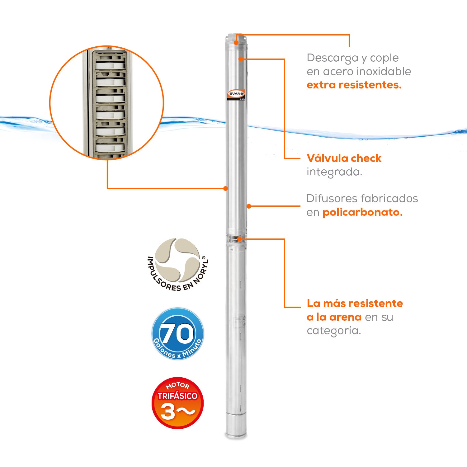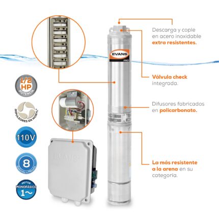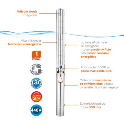 Descripción: Bomba sumergible trifásica para pozo profundo 4″, 70 GPM, descarga de 2″, 10 HP. 220V