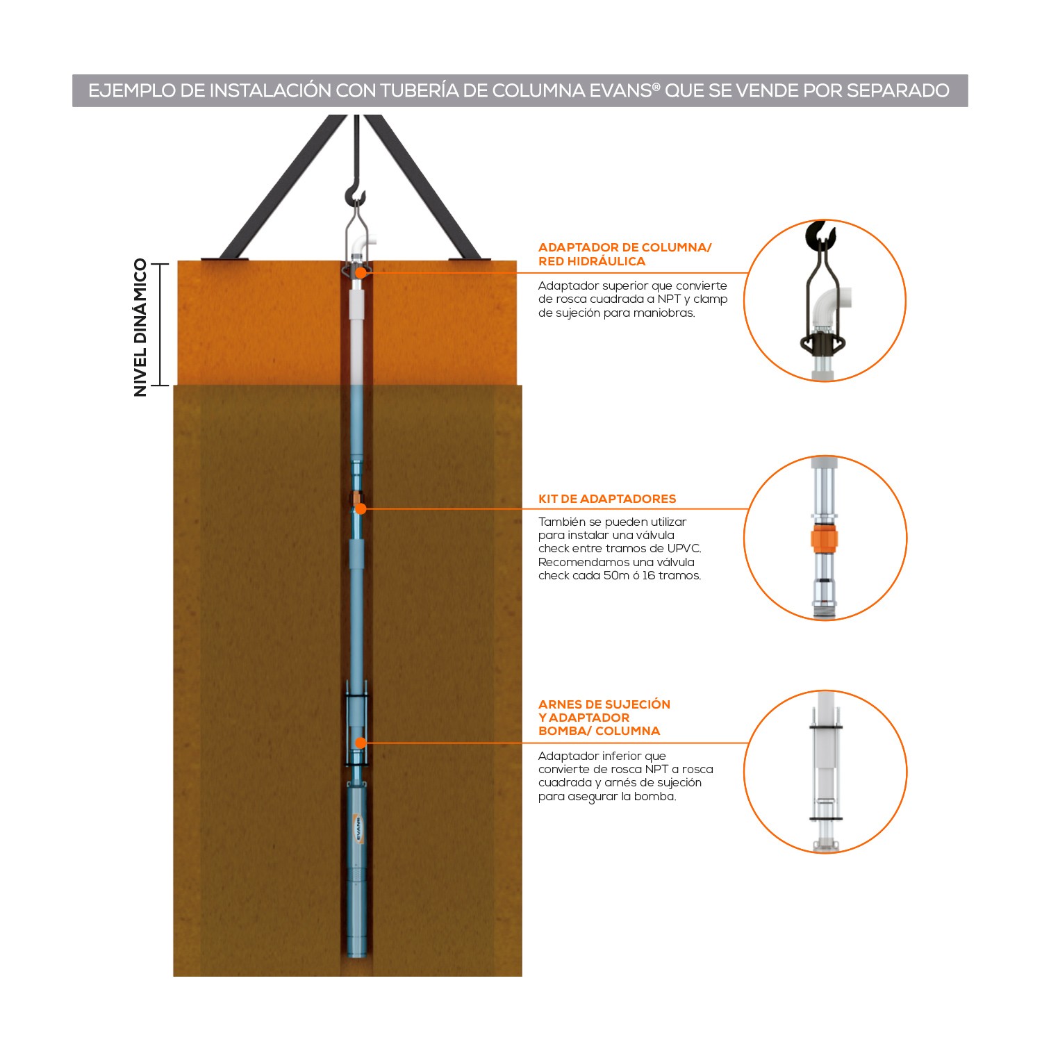 Descripción: Bomba sumergible monofásica para pozo profundo 4″, 8 GPM, descarga de 1.25″, 1/2 HP. 110V
