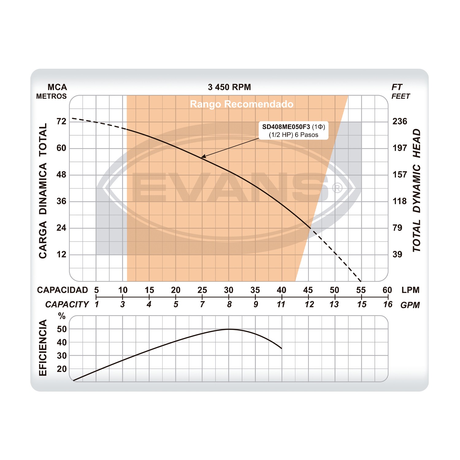 Bomba sumergible monofásica para pozo profundo 4″, 8 GPM, descarga de 1.25″, 1/2 HP. 110V SD408ME050F3