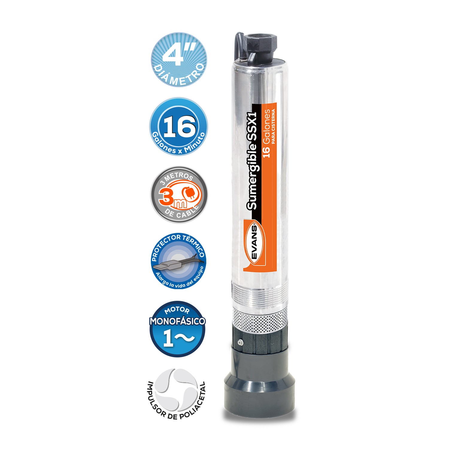 Descripción: Motobomba Sumergible doméstica de acero inoxidable. Motor monofásico de 1 Hp.