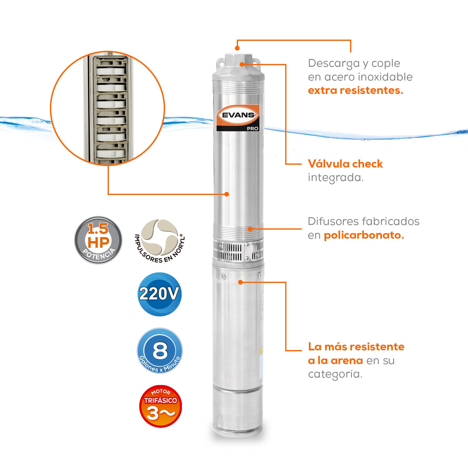 Descripción: Bomba sumergible trifásica para pozo profundo 4″, 8 GPM, descarga de 1.25″, 1.5 HP. 220V