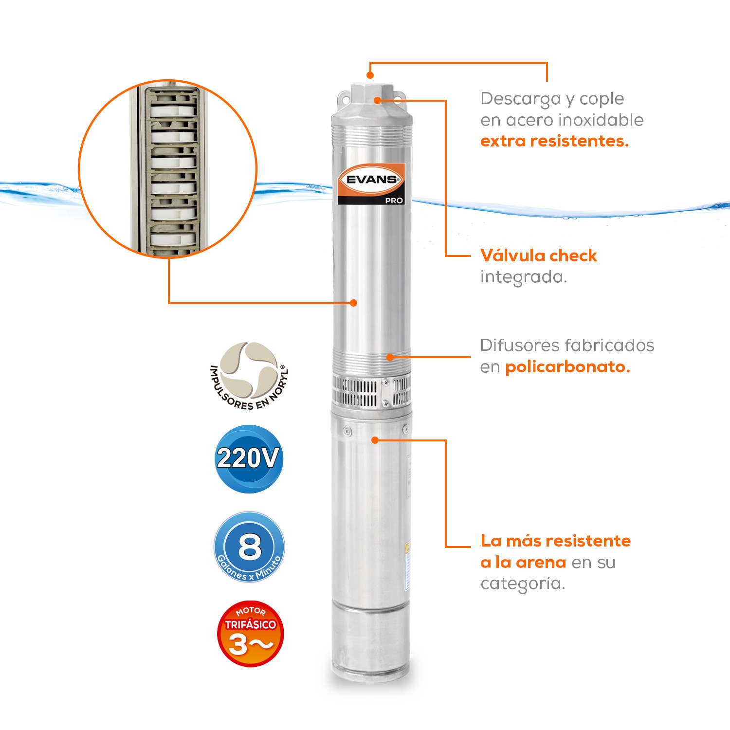 Descripción: Bomba sumergible trifásica para pozo profundo 4″, 8 GPM, descarga de 1.25″, 1 HP. 220V