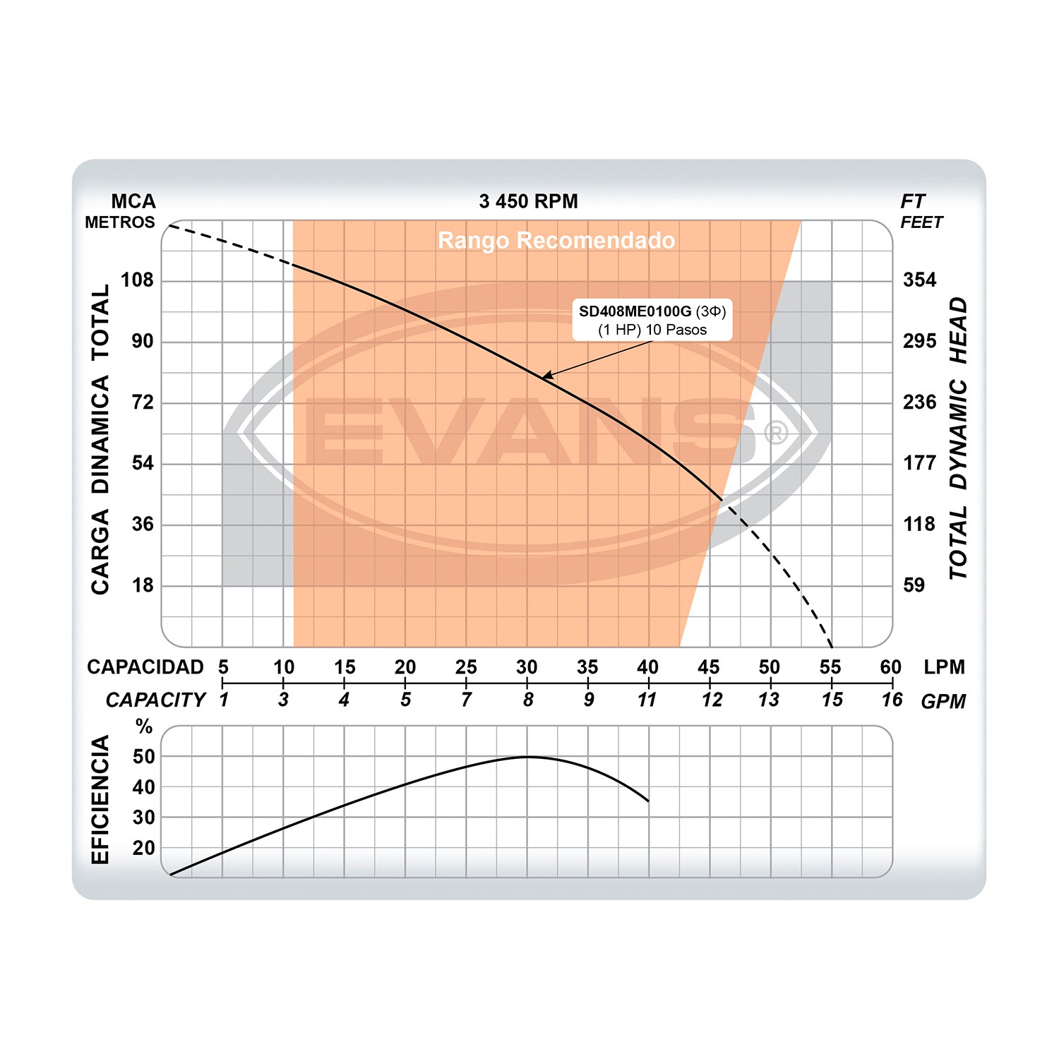 Bomba sumergible trifásica para pozo profundo 4″, 8 GPM, descarga de 1.25″, 1 HP. 220V SD408ME0100G
